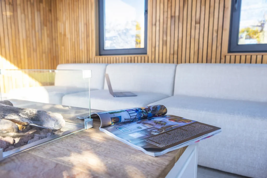Voor de koudere dagen biedt een overkapte, verwarmde lounge met een stijlvolle gaskachel de perfecte plek om te ontspannen. Hier kun je comfortabel genieten van de buitenlucht, zelfs als de temperatuur daalt. De lounge is de ideale ruimte voor een ontspannen avond, of je nu een goed boek leest, geniet van een glas wijn, of tijd doorbrengt met vrienden en familie.